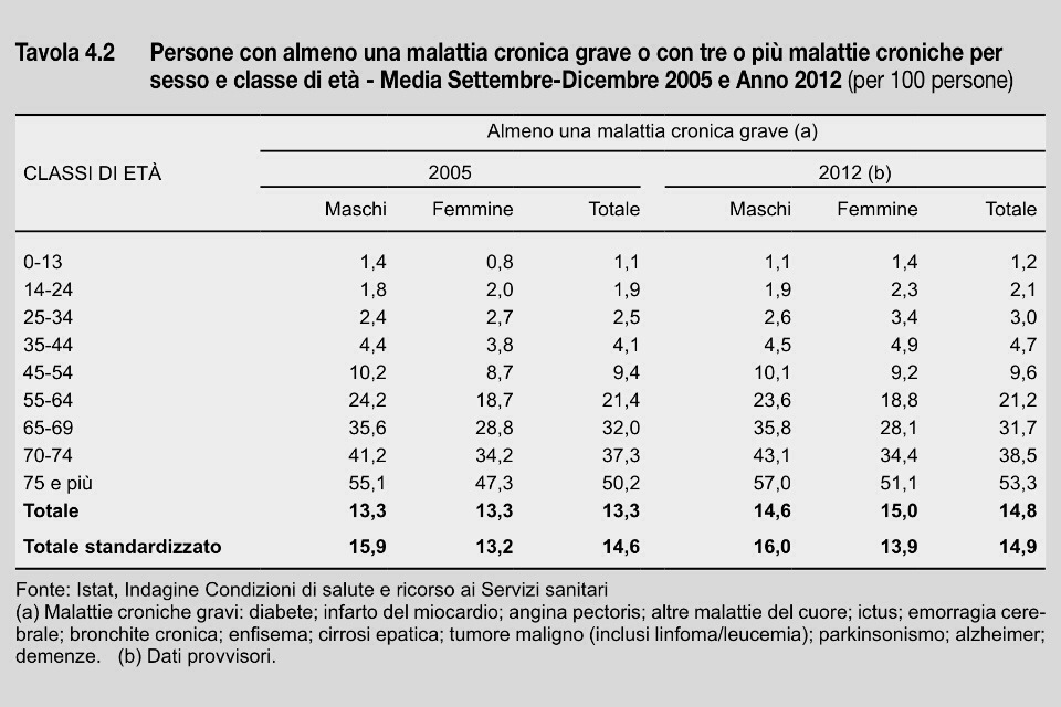 Si segnala inoltre come siano in aumento “le persone che soffrono di almeno una patologia cronica grave”, determinato da “un incremento della popolazione anziana esposta al rischio di ammalarsi (nel 2012 sono il 14,8 per cento della popolazione, con un aumento di 1,5